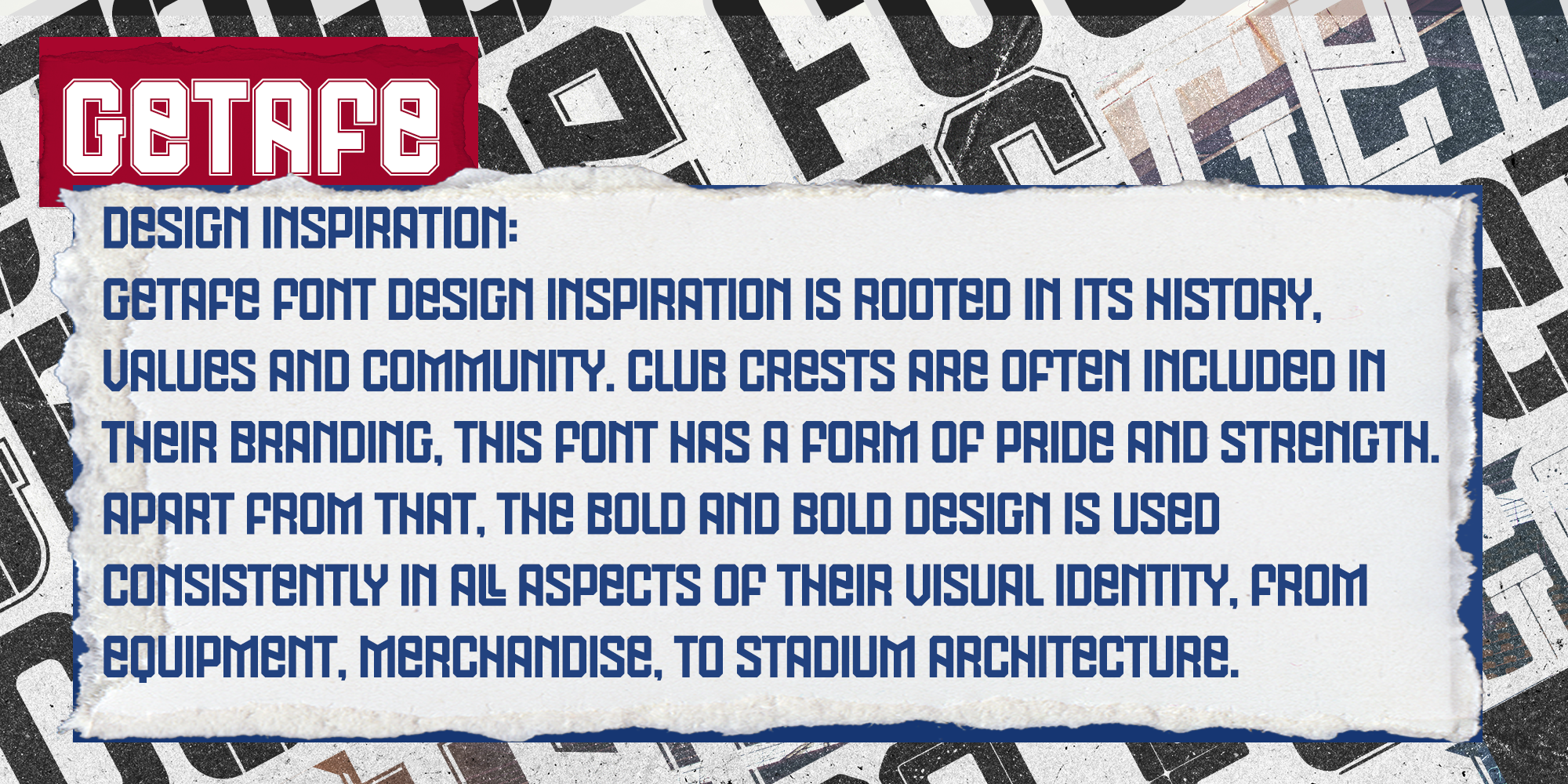 Getafe font design inspiration is rooted in its history, values and community. Club crests are often included in their branding, this font has a form of pride and strength. Apart from that, the bold and bold design is used consistently in all aspects of their visual identity, from equipment, merchandise, to stadium architecture.