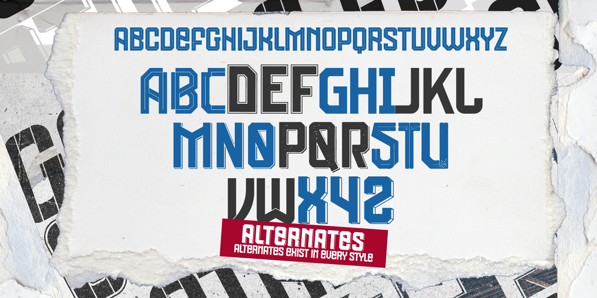 Getafe is a fearless athletic font family with 11 creative styles for added flexibility and variation. It’s perfect for sports logos, branding, posters, apparel design with it’s bold and confident appearance. The uppercase characters comes with different renders to add authenticity and a more natural worn look.